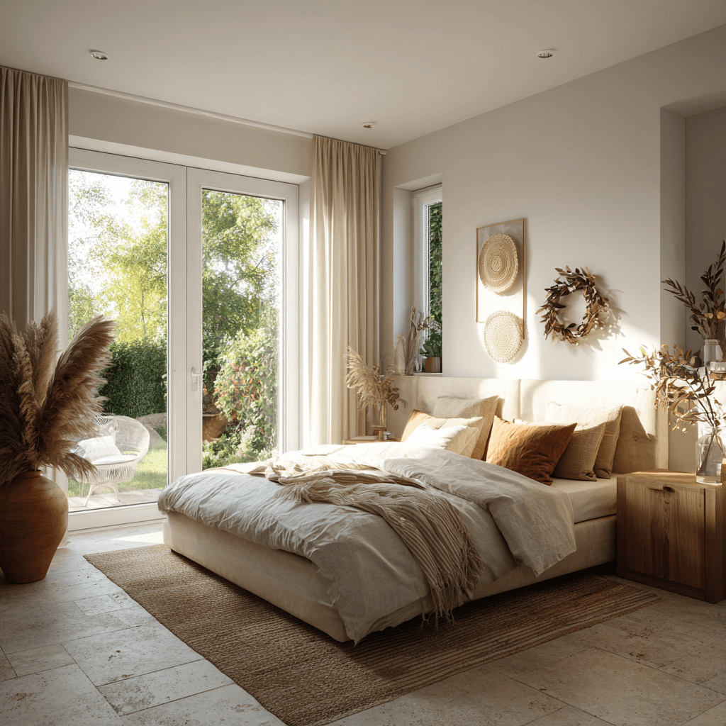 Das Schlafzimmer bietet eine ruhige Rückzugsoase mit viel Licht und Blick ins Grüne. Die großzügige Fensterfront schafft eine entspannte Atmosphäre. Dezente Farben und natürliche Materialien unterstützen erholsamen Schlaf und ein angenehmes Wohngefühl.