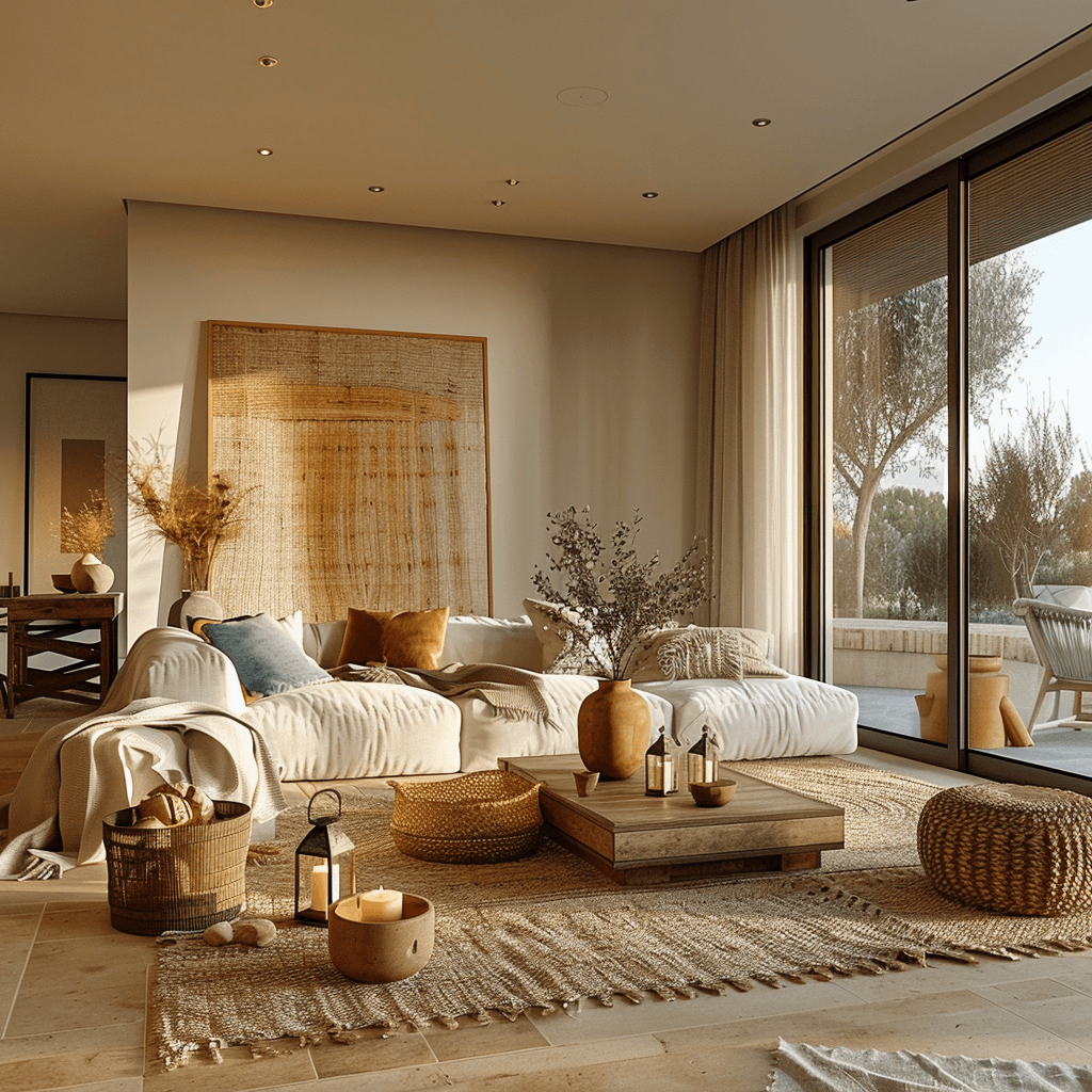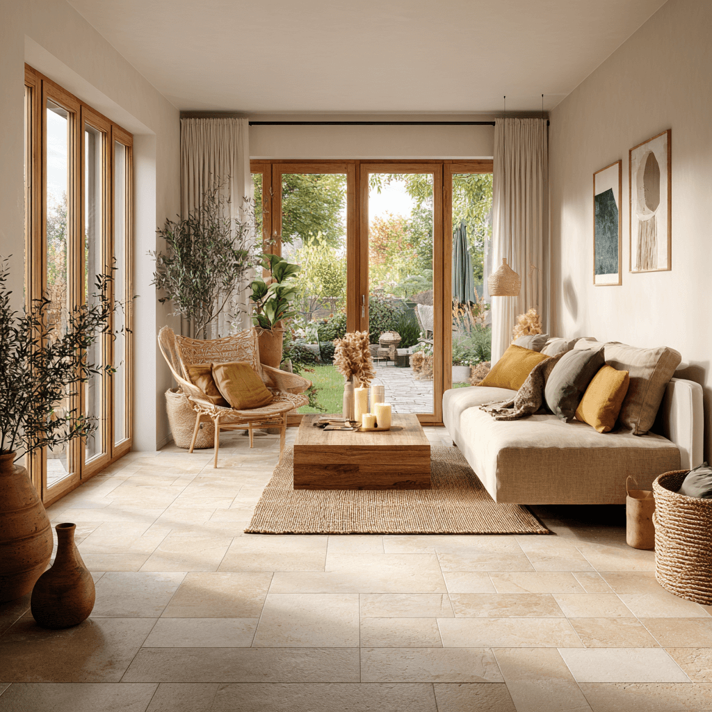 Der offene Wohnbereich wirkt hell, ruhig und einladend. Bodentiefe Fenster schaffen eine fließende Verbindung zwischen Innenraum und Garten. Natürliche Materialien und warme Farbtöne unterstreichen das wohnliche, zeitlose Raumgefühl. Ein Ort zum Entspannen und Zusammenkommen.